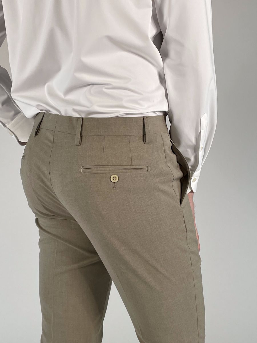 Pantalone: chiusura con zip, gancio e bottone.