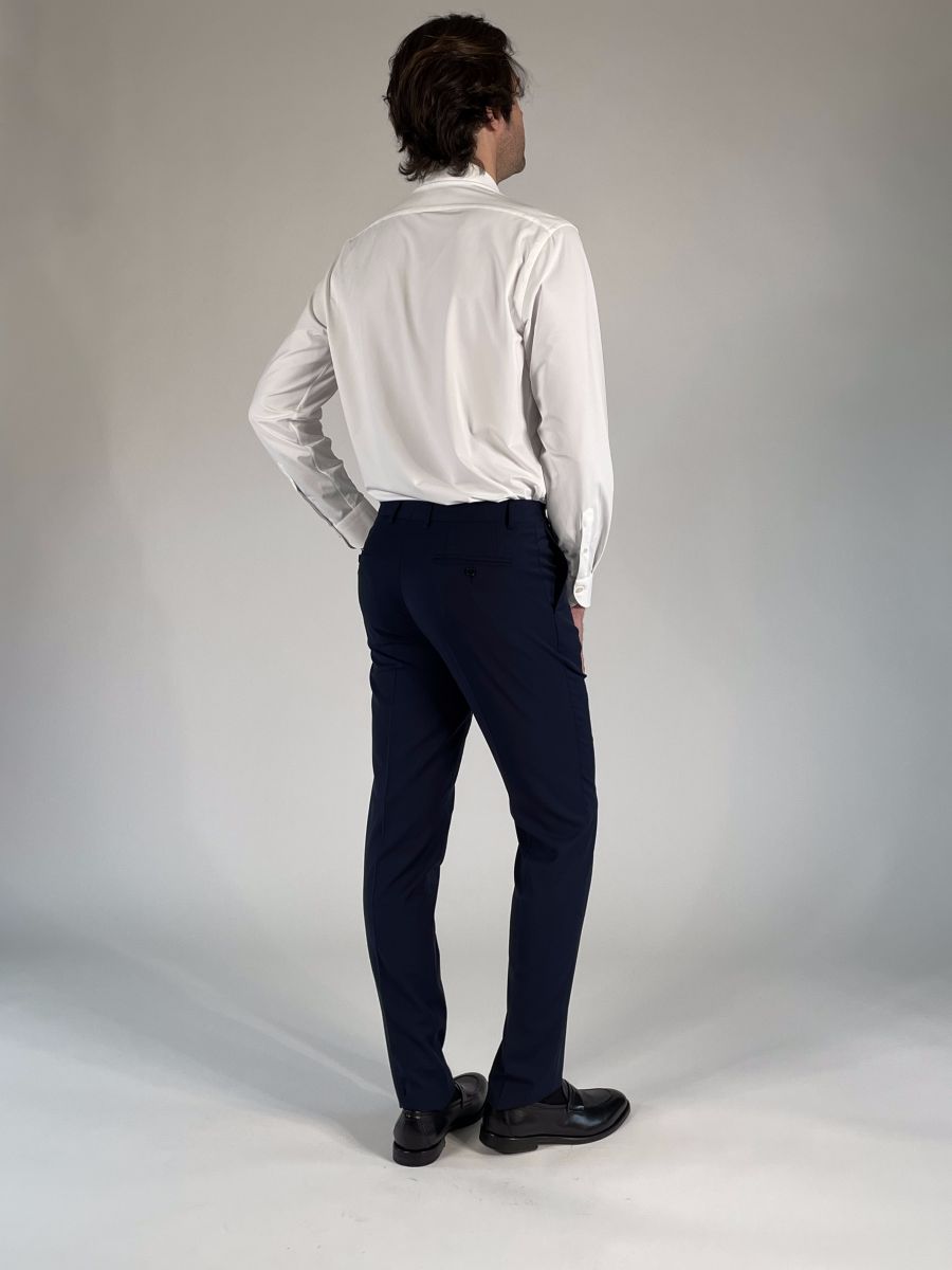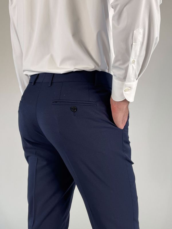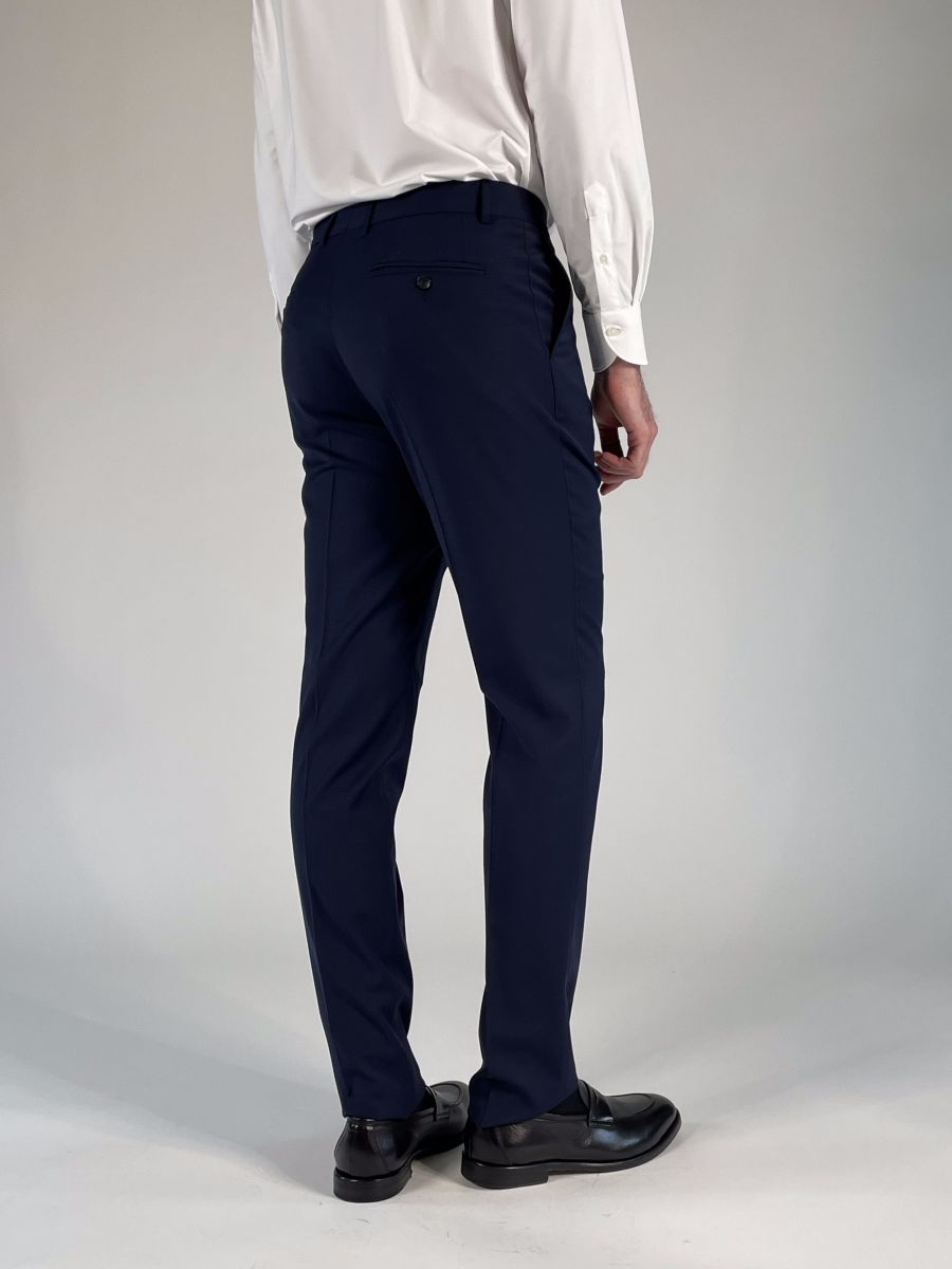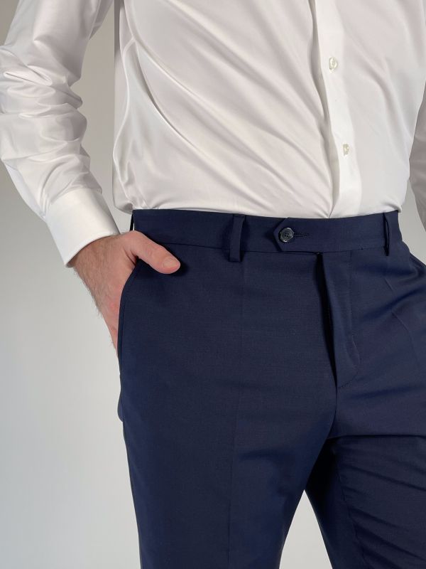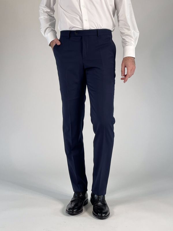 Pantalone gamba dritta, chiusura con zip, gancio e bottone.