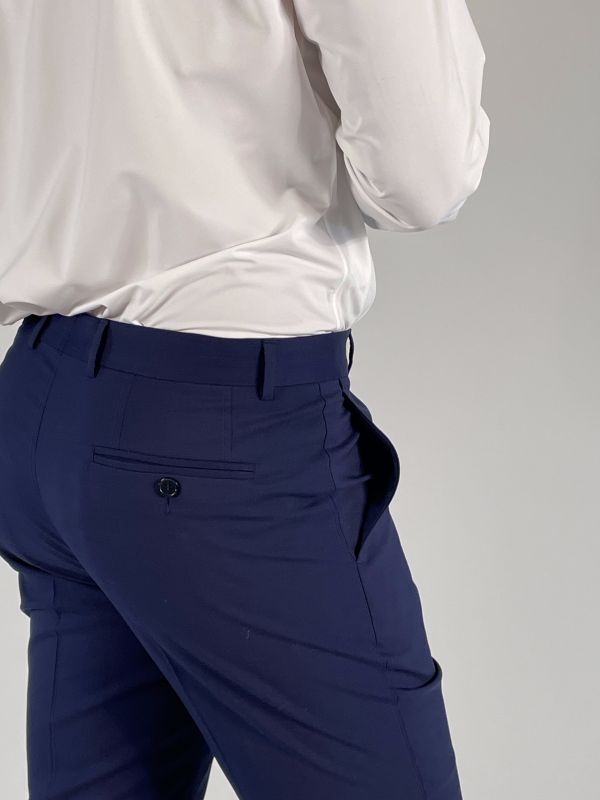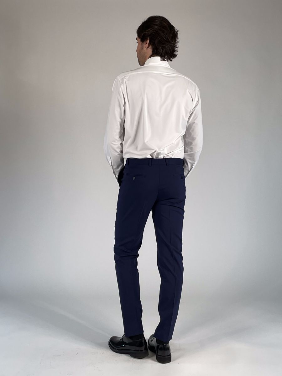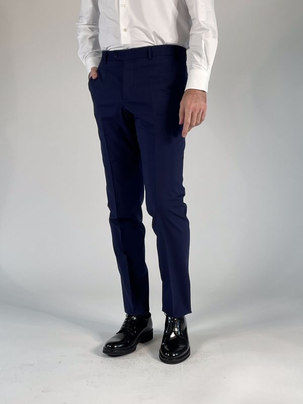 Pantalone gamba dritta, chiusura con zip, gancio e bottone.