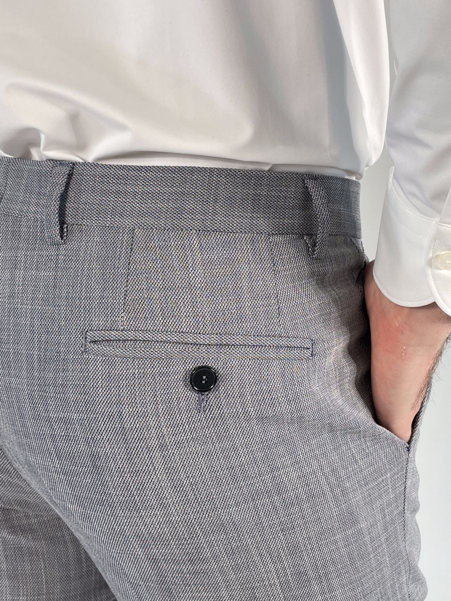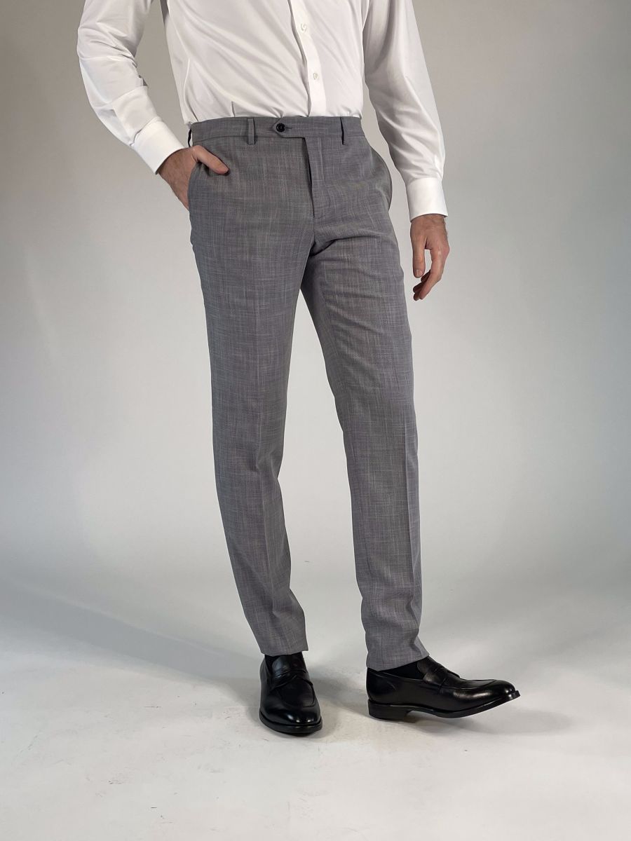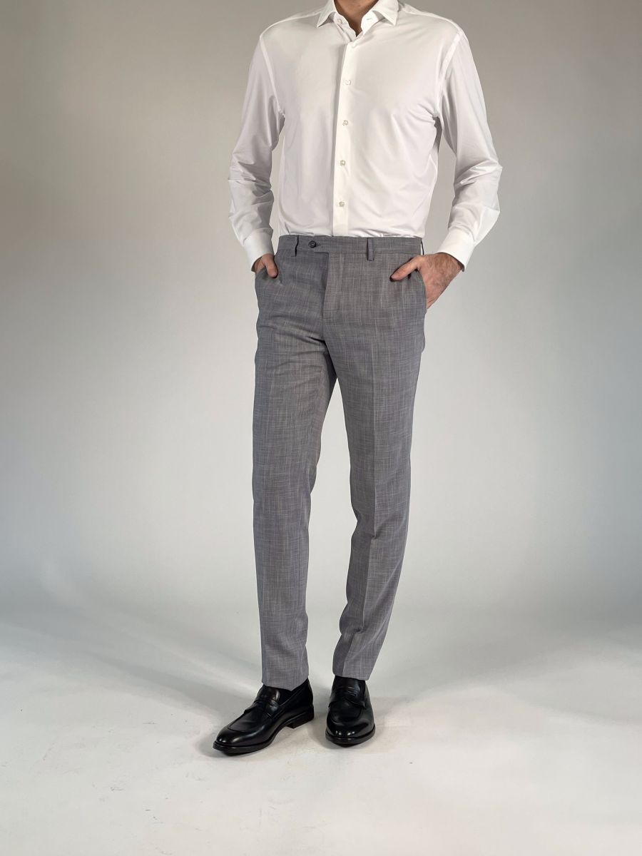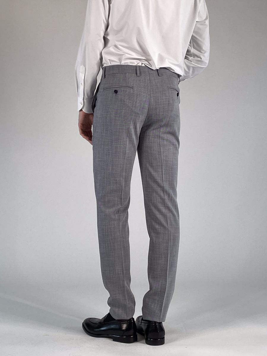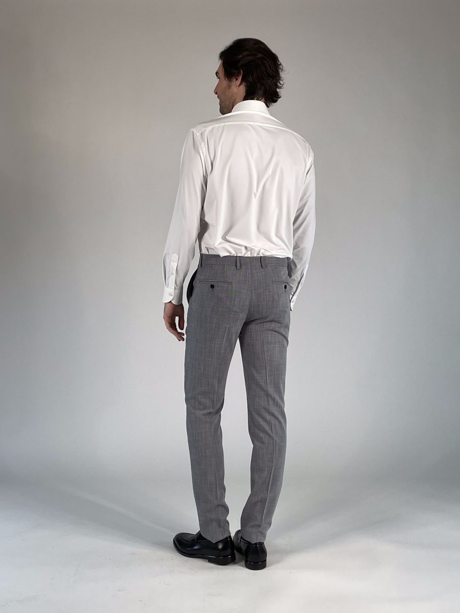Pantalone gamba dritta, chiusura con zip, gancio e bottone.