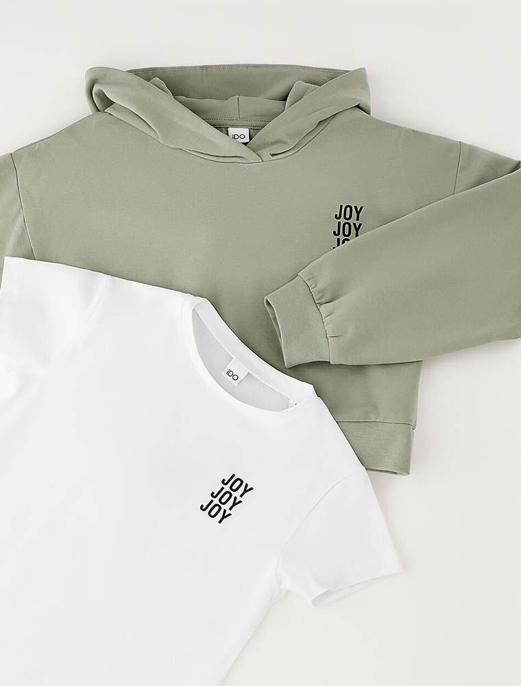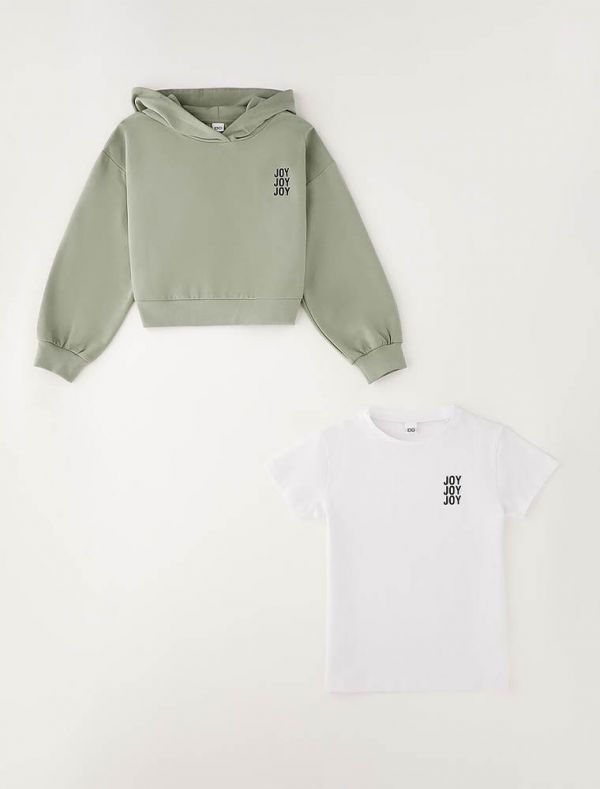 T-shirt manica corta + felpa con cappuccio.