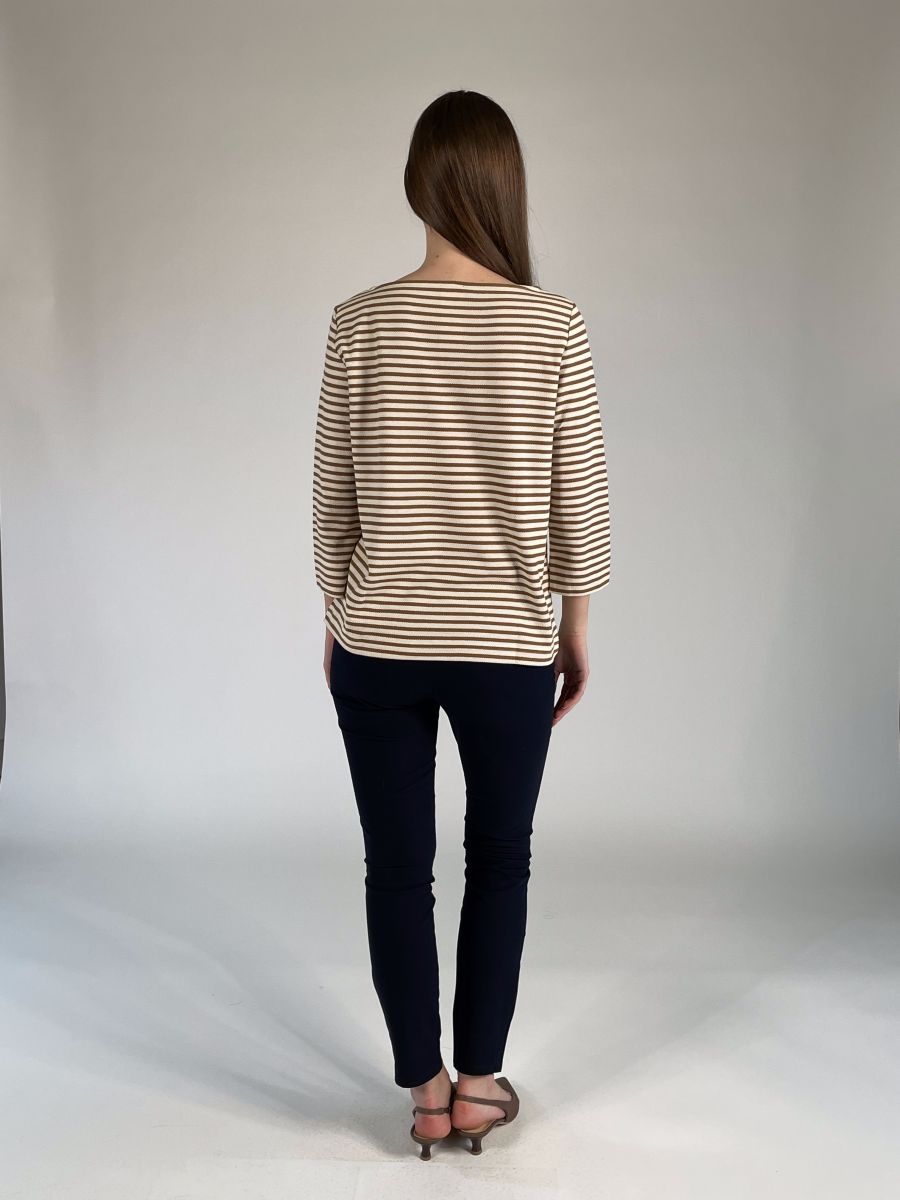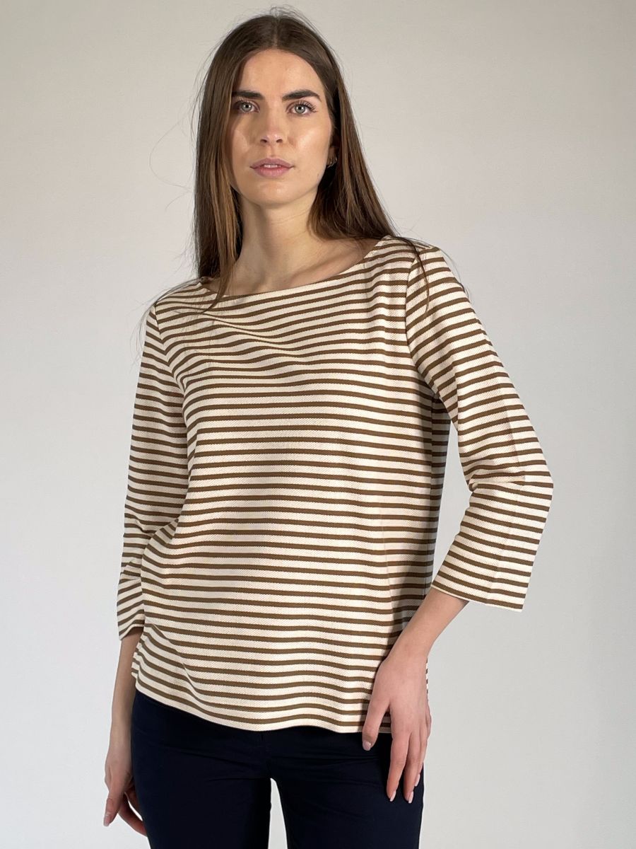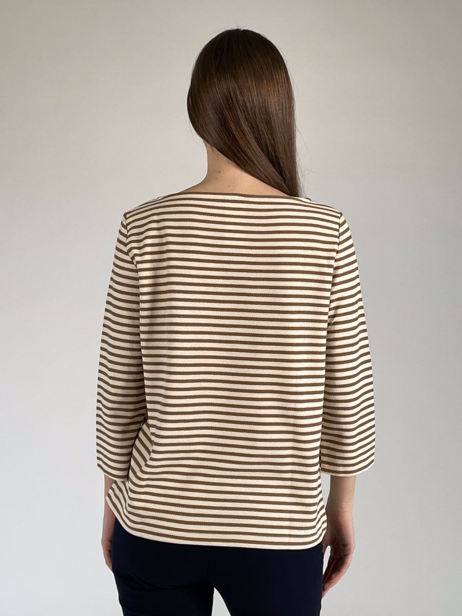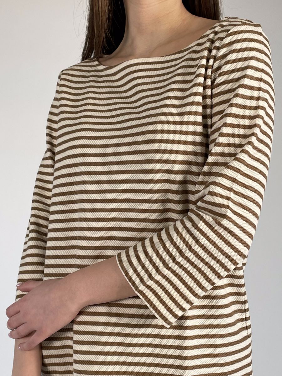 Modello con scollo a barchetta e maniche a tre quarti.