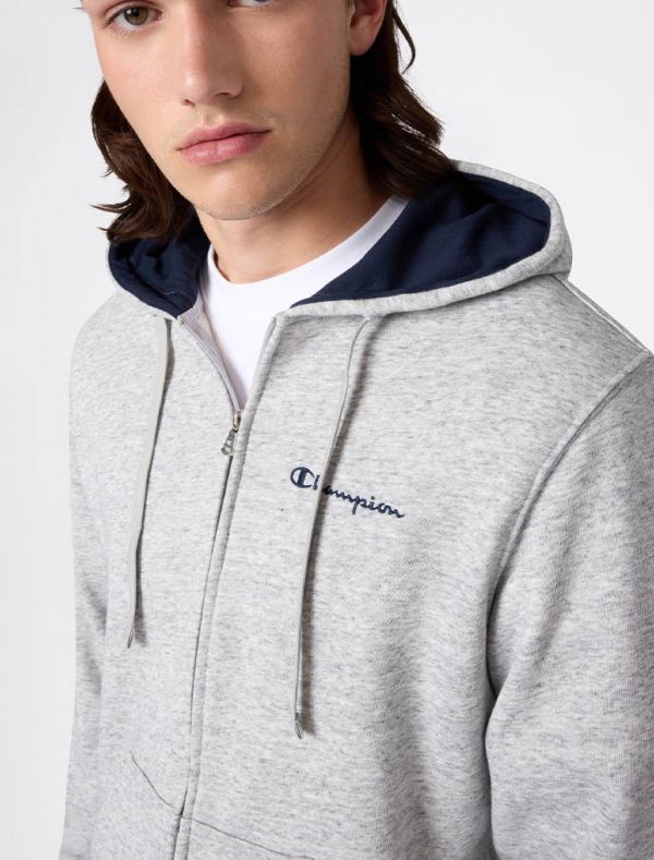 Felpa aperta con cappuccio, chiusura con zip, due tasche frontali.