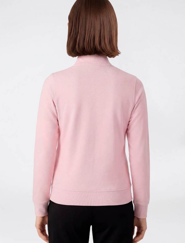 felpa aperta con colletto, chiusura con zip, due tasche laerali a filetto, polsini e fondo a coste.
